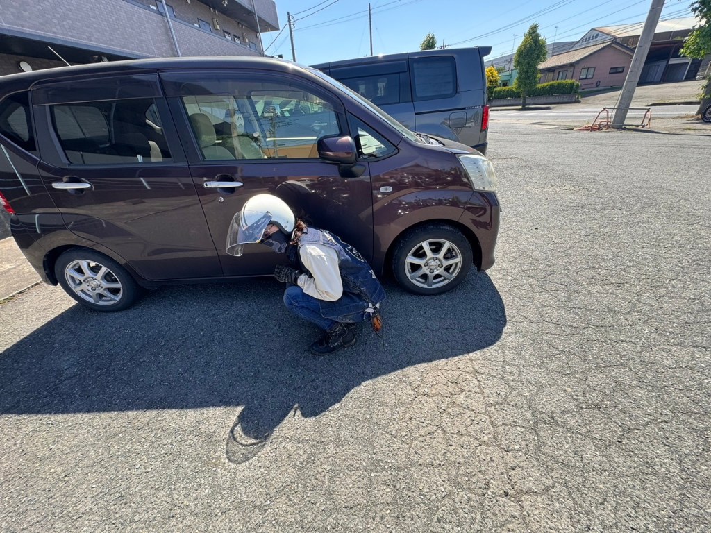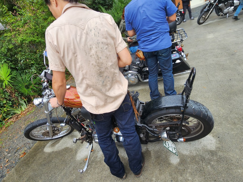 メカニックのDさんの愛車も心なしかいつもよりフロントフォークが長い?!
